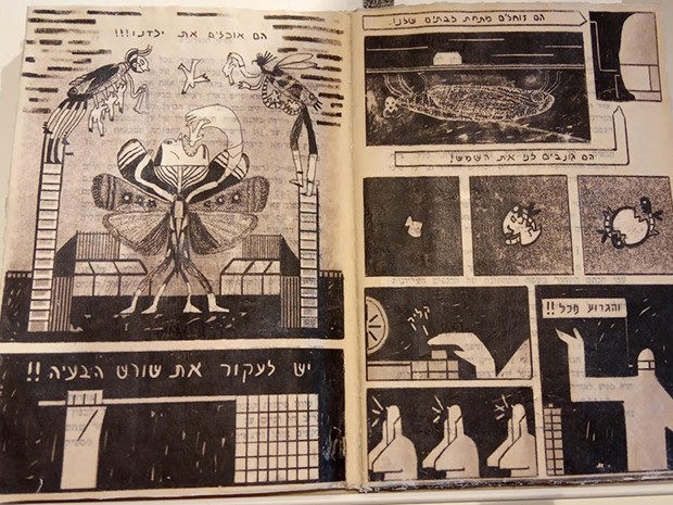 במהלך שבוע האיור היינו שותפים לכמה וכמה אירועים בת״א שבהם הוצגו עבודות סטודנטים ומרצים של המחלקה. אחת מהתערוכות המרתקות היתה ״תאונה, מלחמה, שולחן עבודה״ – בגלריה מנשר. של גלעד סלקטר מרצה במחלקה מספר על תהליך עבודתו על ספר הקומיקס שלו – צו 8.