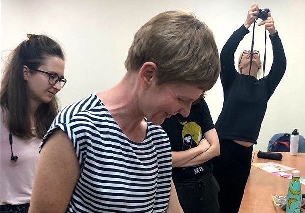 בתמונה מטה: הסטודנטים מתרגלים שימוש במסך ירוק המשמש להלבשת רקע לדמות בוידאו